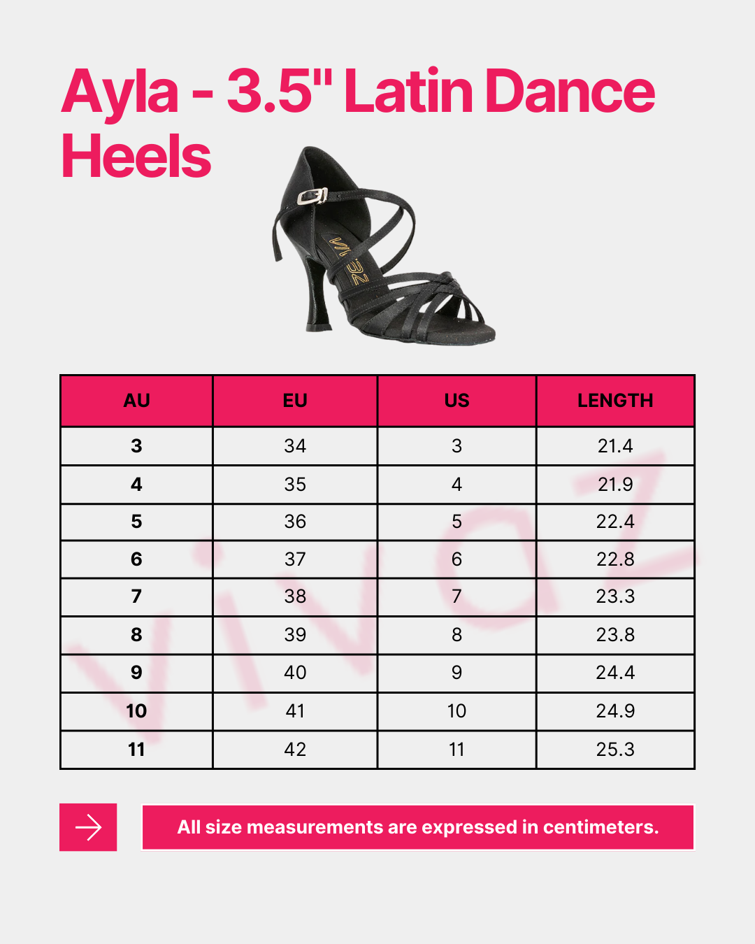 Ayla is made in Euro sizing and is true to size, designed for a firm, snug fit—just as dance shoes should be. If you prefer a tighter fit, consider ordering your usual size or one size down.
