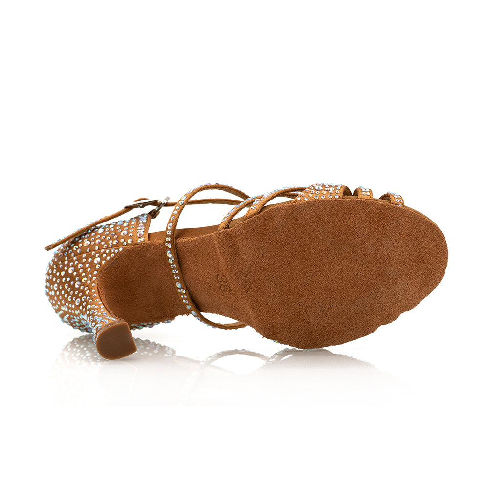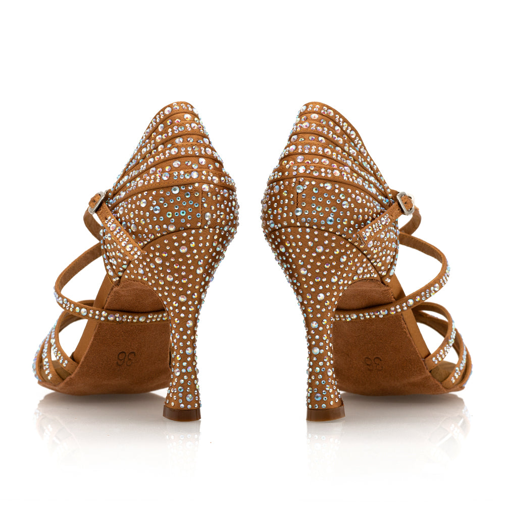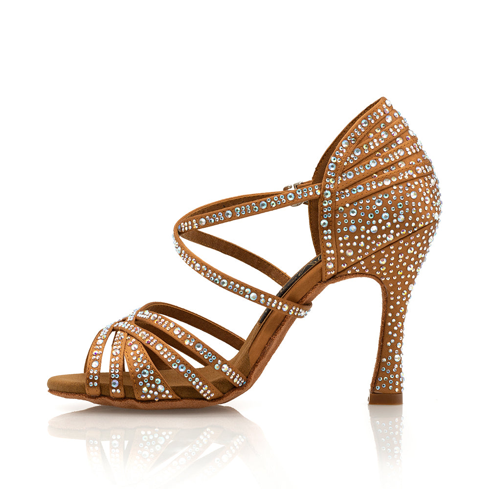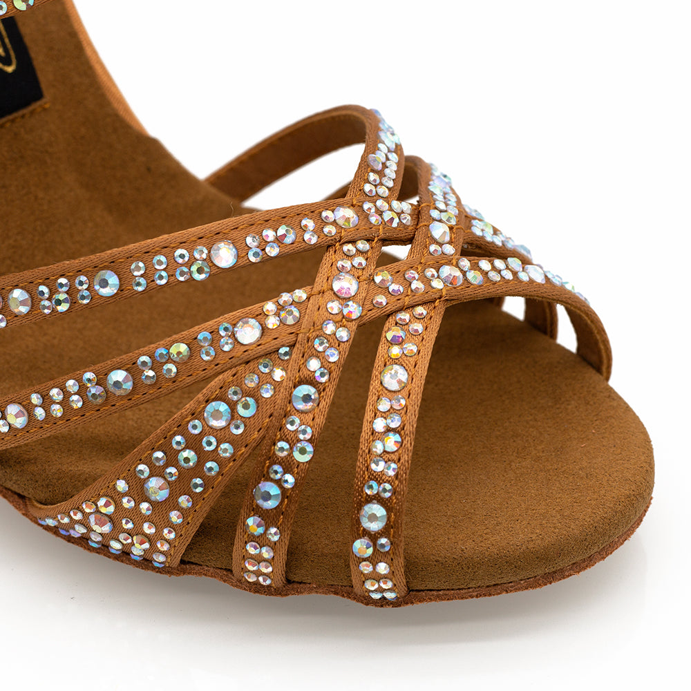 Our #1 Bestselling Dance Shoes, Paris, are inspired by the romantic charm of Paris, the most romantic city in the world. Featuring a 3.75" flared heel, Toast Tan Satin outer material, and our trademark Vivaz ultra flex sole with built-in gel insole, Paris is designed to flex and mould with every foot movement. Adorned with sparkling crystals, they are as dazzling as they are comfortable.