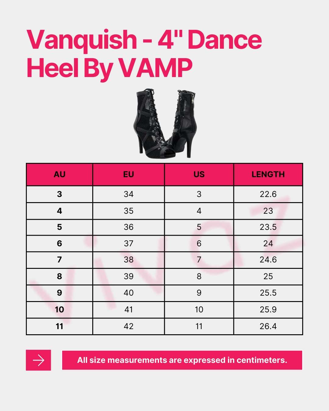 Vanquish is true to EU sizing and offers a snug, firm fit. If you are unsure about your size, we recommend contacting one of our trained fit specialists. You can reach us via email at support@vivazdance.com.au.