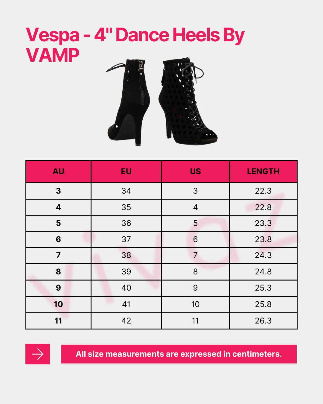 If you would like any assistance to help you find the right fit, please contact one of our trained fit specialists on the chatbox to the bottom right of your screen, call 02 8378 6697 or email support@vivazdance.com.au.